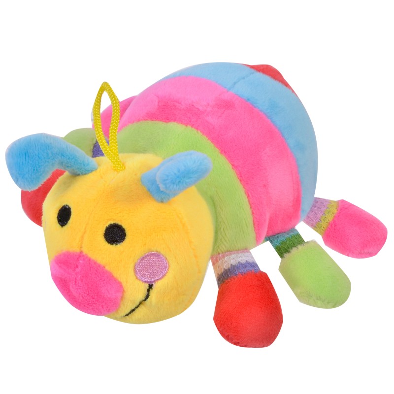 Плюшена играчка дрънкалка за бебета във формата на симпатична многоцветна стоножка.