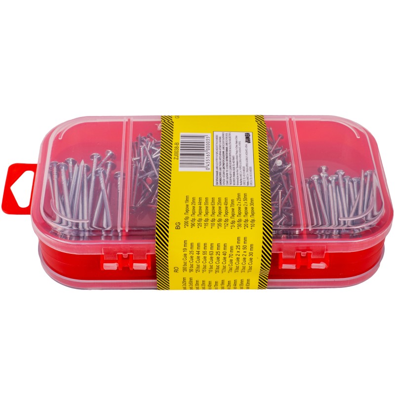 Икономична опаковка от 450 броя пирони с различни размери в практична пластмасова кутийка за съхранение.