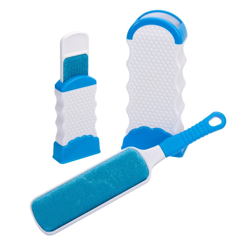 Комплектът за почистване на косми и влакна включва голяма четка, малка четка, подходяща за пътуване и поставки за почистване.