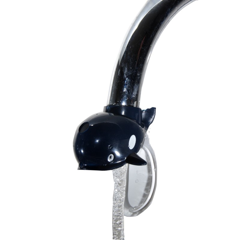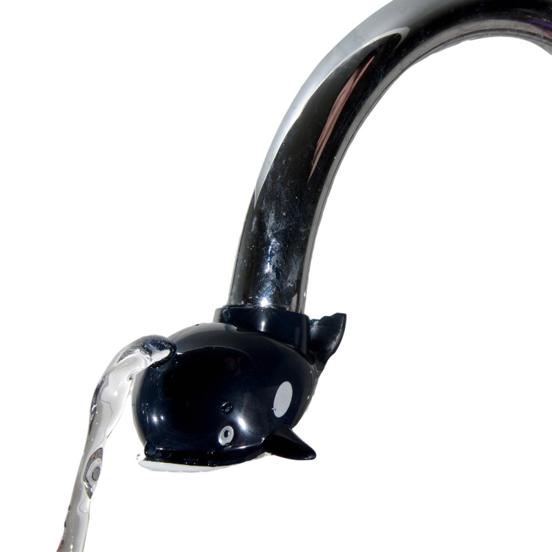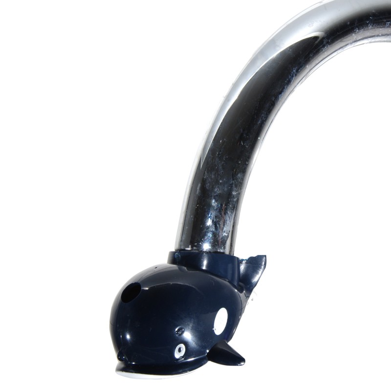 Ефектна приставка за кран на чешма във формата на кит, изработена от здрава и устойчива пластмаса в черен цвят.