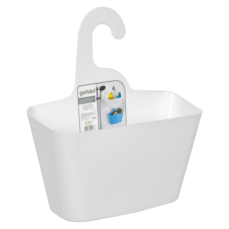 Окачваща се кошница за баня, изработена от здрава и устойчива пластмаса в бял цвят.