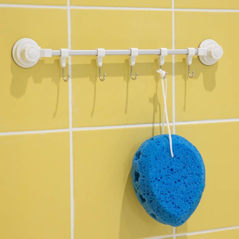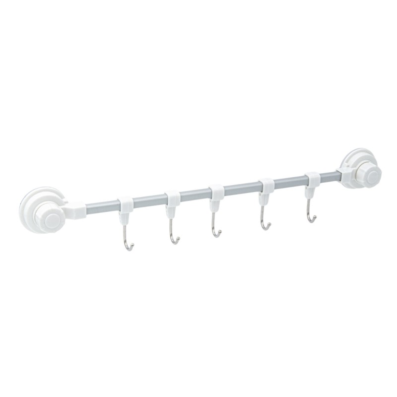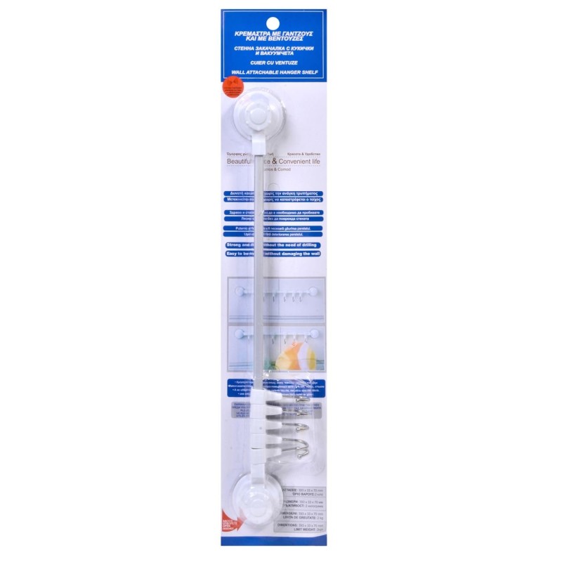 Стенна закачалка, изработена от висококачествена пластмаса в бял цвят с метални кукички и вакуумни вендузи за стабилно захващане.