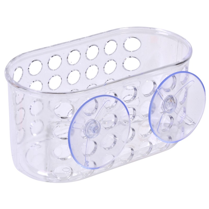 Висяща поставка за тоалетни принадлежности, изработена от здрава и устойчива прозрачна пластмаса.
