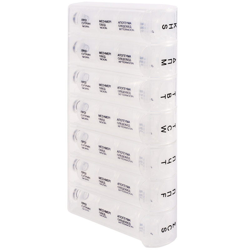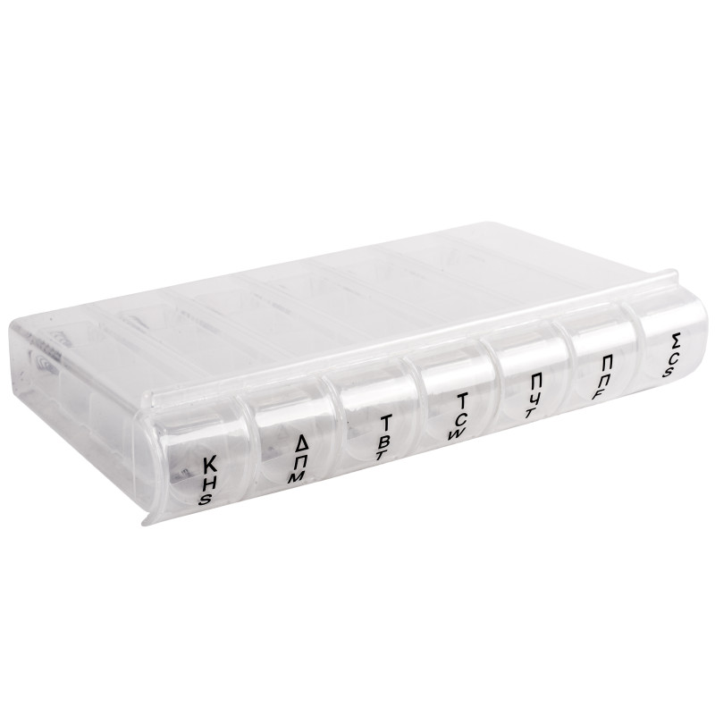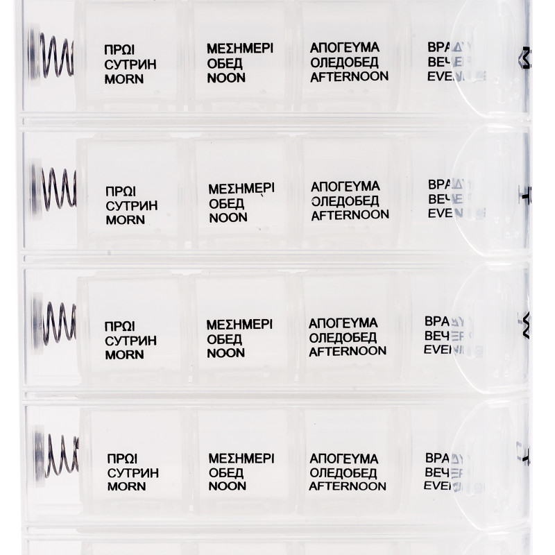 Голяма пластмасова кутия за хапчета с отделения с индекси за дните от седмицата и надписи (сутрин, обед, следобед, вечер) за напомняне на Вашето медикаментозно лечение.