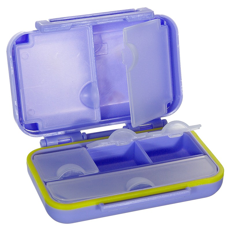 Правоъгълна кутия за хапчета, изработена от плъттна и устойчива пластмаса в син цвят.