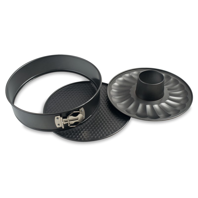 Метална форма за печене с два вида падащо дъно - за кекс и торта с пружина, гарантираща отлични резултати и лесно отделяне.