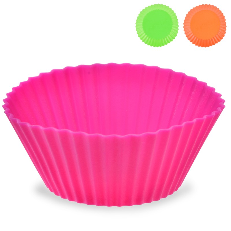 Комплект от 6 броя силиконови мини форми за печене на мъфини в различни цветове - цикламено, зелено и оранжево.