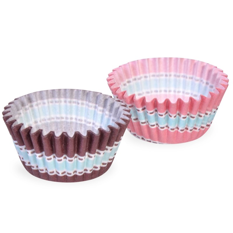 150 броя хартиени формички за печене на мъфини в розово и кафяво със светло синя шарка.