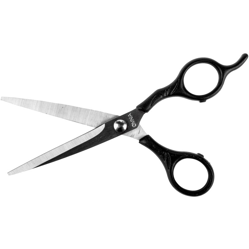 Фризьорска ножица за подстригване, изработена от неръждаема стомана с пластмасови дръжки в черен цвят.
