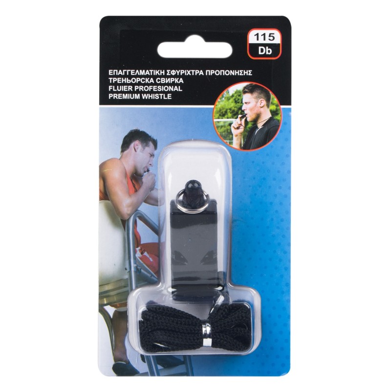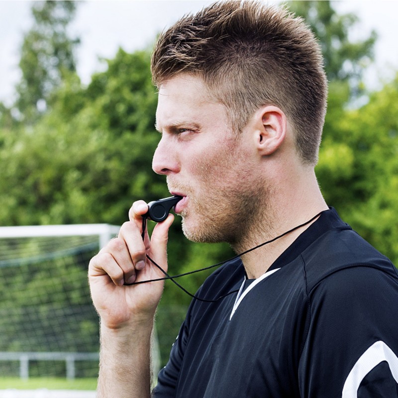 Пластмасова треньорска свирка в черен цвят с връзка за окачване на врата.