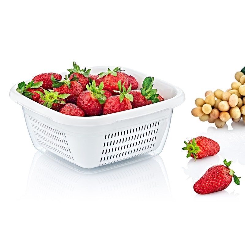 Кухненски комплект от пластмасова купа за миене на плодове и зеленчуци с практична цедка за отцеждане на водата.