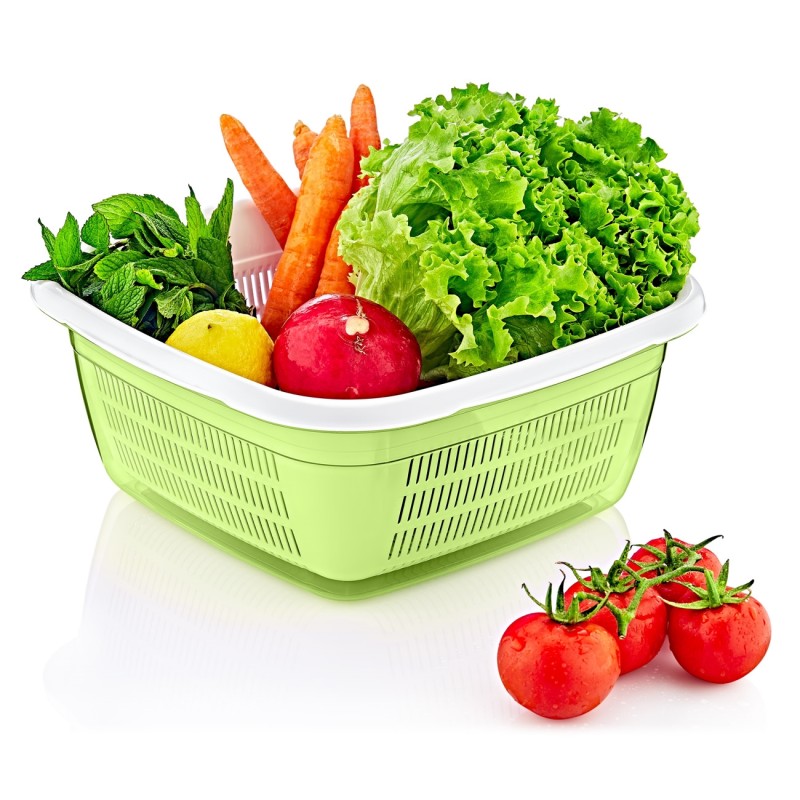 Кухненски комплект от пластмасова купа с квадратна форма в зелен цвят за миене на плодове и зеленчуци с практична цедка за отцеждане на водата.