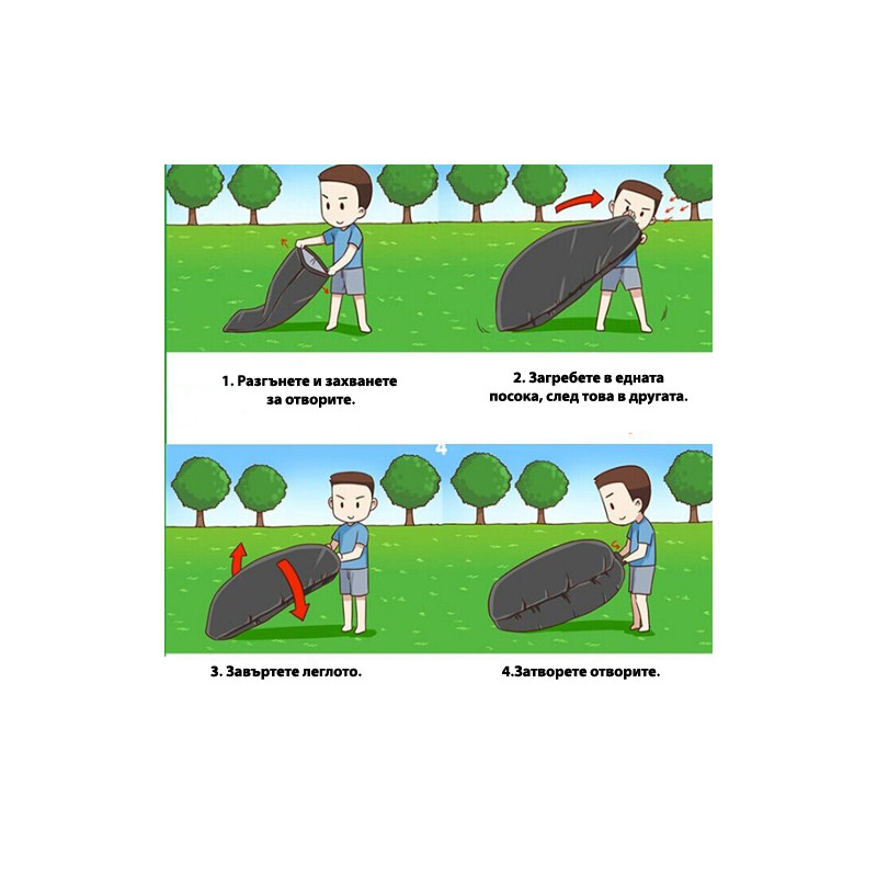 Надуване – Извадете леглото от раничката, загребете на дясно, след това на ляво докато не се напълнят и двата тунела. Затворете отворите.