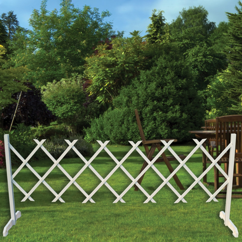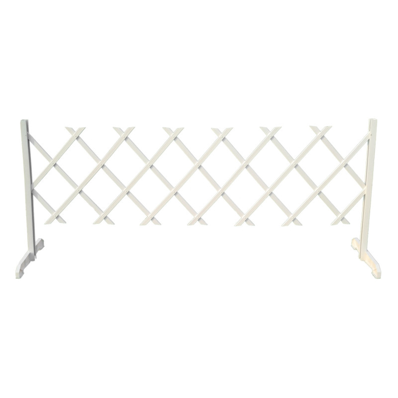 Сгъваема градинска ограда с широки и стабилни крака, изработена от здрава и устойчива пластмаса в бял цвят.