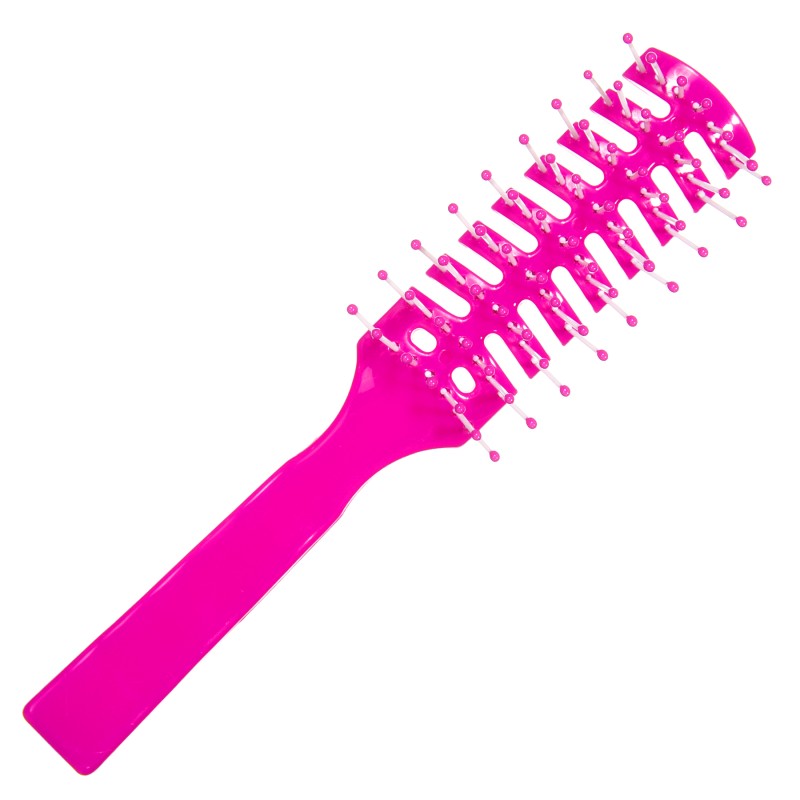 Продълговата четка за коса, изработена от качествена и трайна пластмаса в цикламен цвят.