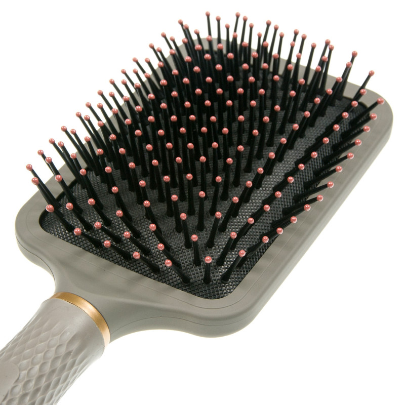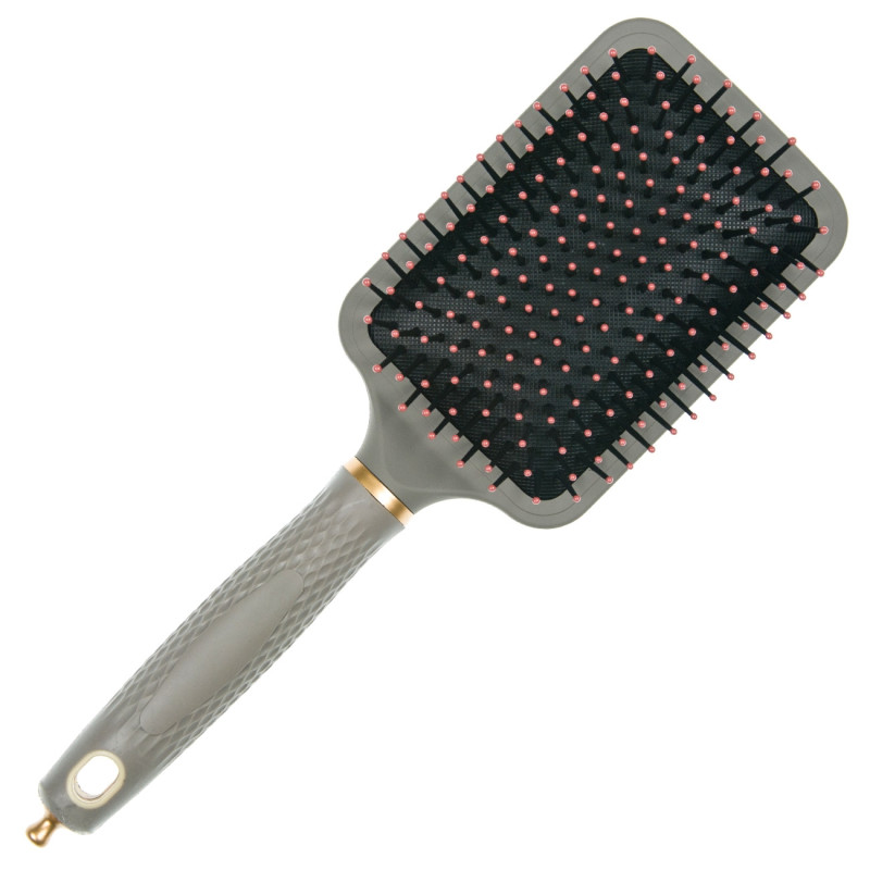 Правоъгълна четка за коса, изработена от качествена и устойчива пластмаса в сив цвят.
