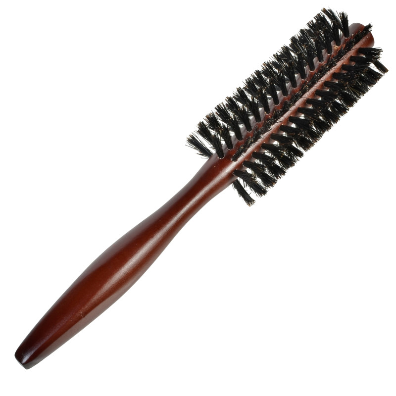 Цилиндрична четка за коса, изработена от качествена дървесина в кафяв цвят.