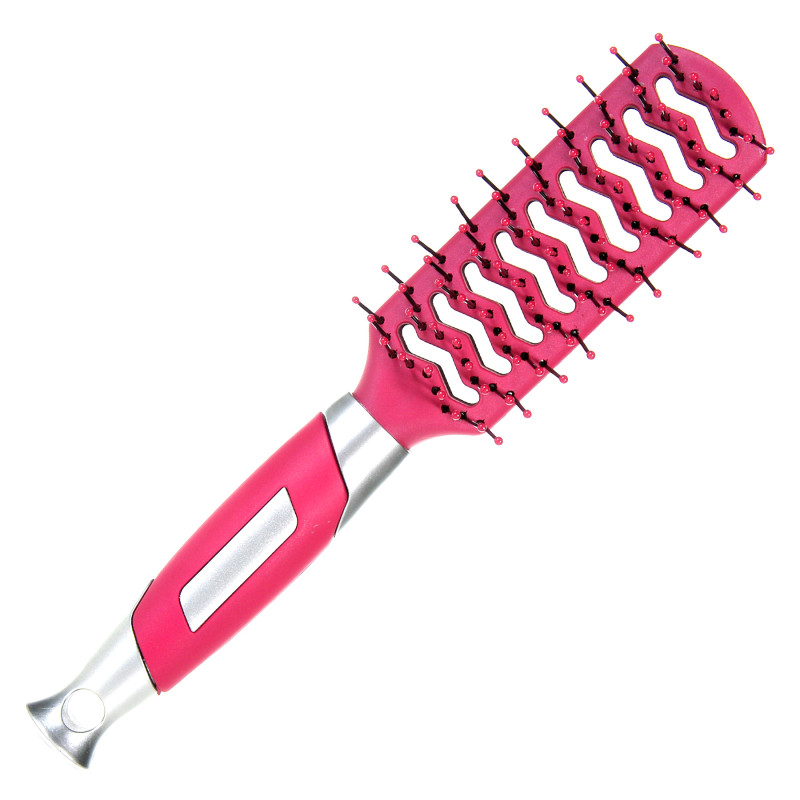 Продълговата четка за коса, изработена от качествена и трайна пластмаса в розов цвят със сребристи акценти.