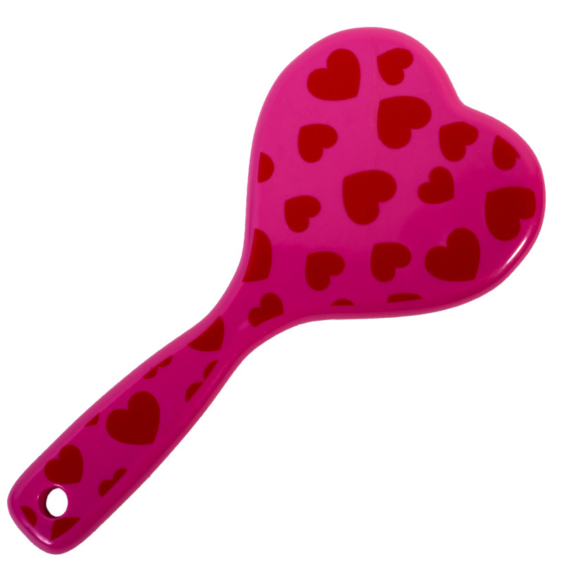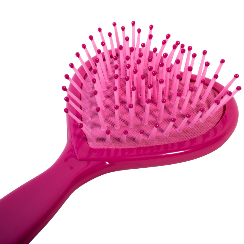 Детска четка за коса, изработена от качествена и устойчива пластмаса в цикламен цвят във формата на сърце.