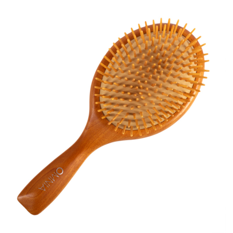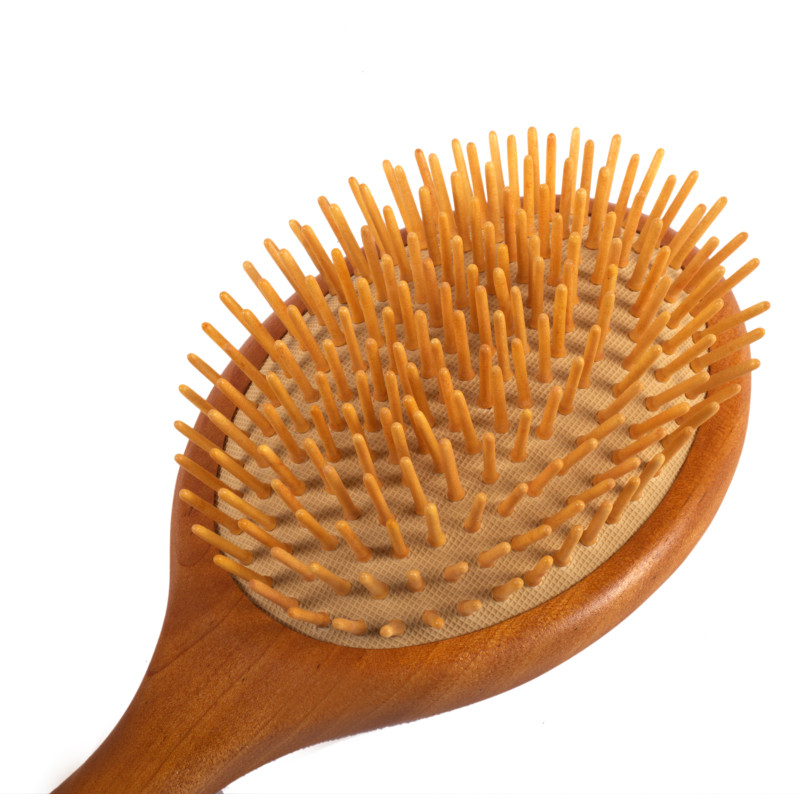 Четката за коса има заоблени щифтове, щадящи скалпа.