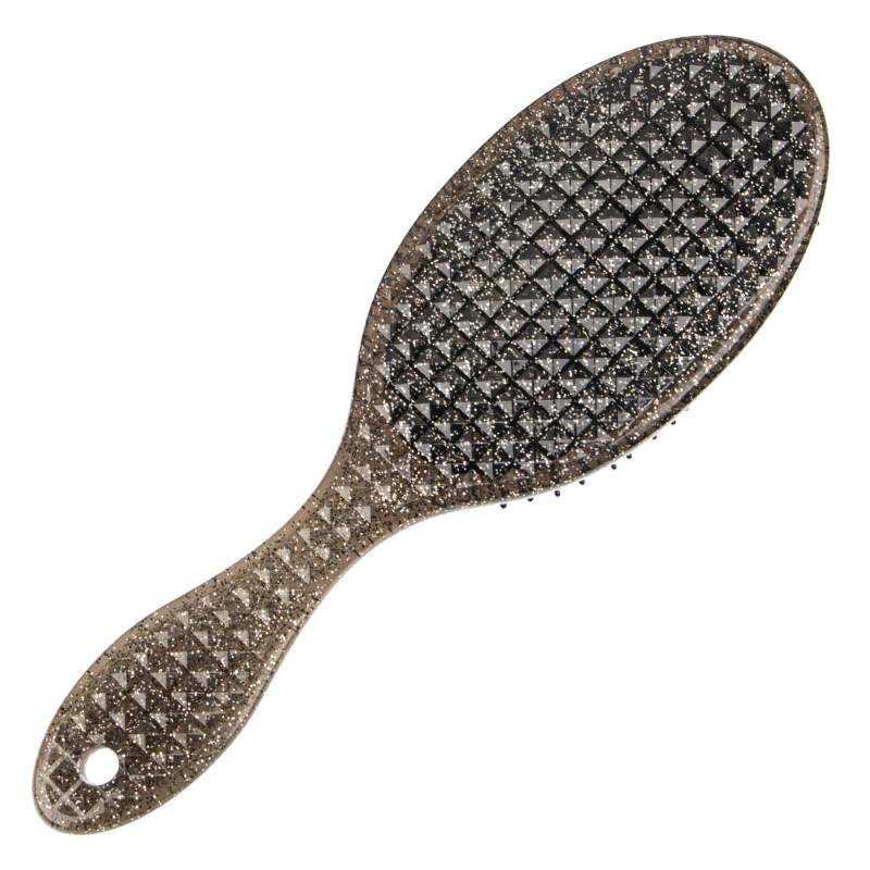 Четка за коса, изработена от качествена и устойчива пластмаса в кафяв цвят с блестящи частици брокат.