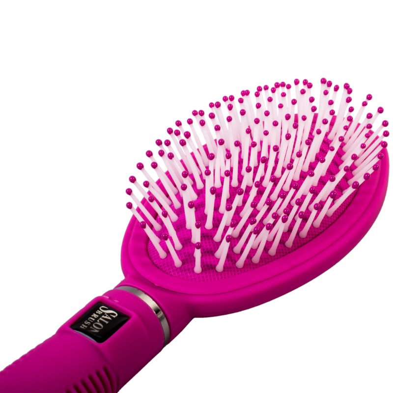 Четка за коса, изработена от качествена и устойчива пластмаса в цикламен цвят с овална форма.