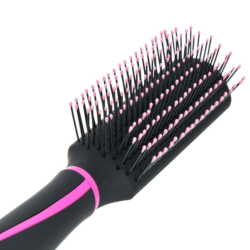 Четката за коса има пластмасови щифтове, които завършват с топчета, щадящи скалпа.