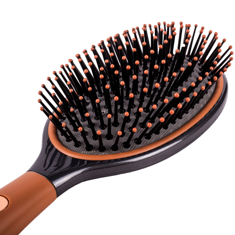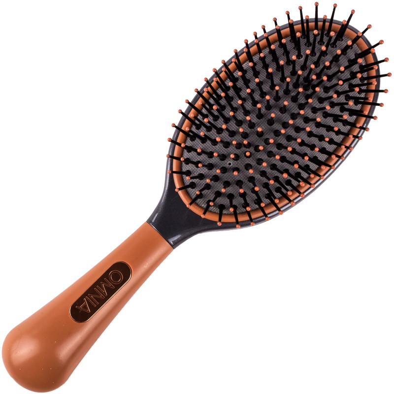 Овална четка за коса, изработена от качествена и здрава пластмаса в светло кафяв цвят с черни детайли.