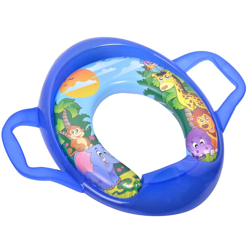 Детска подвижна седалка за тоалетна чиния, изработена от трайна пластмаса в син цвят с щампа на животните от джунглата и две дръжки ръкохватки, които ще помагат на детето да остане на място и ще му вдъхват увереност.
