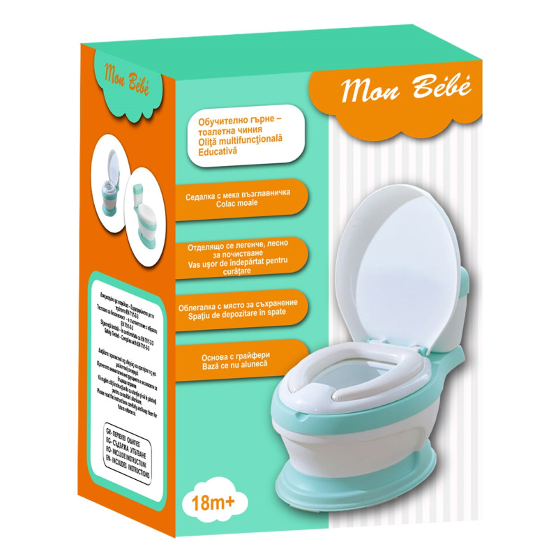 Бебешко гърне с капак, изработено от качествена и здрава пластмаса в бяло и резедаво.
