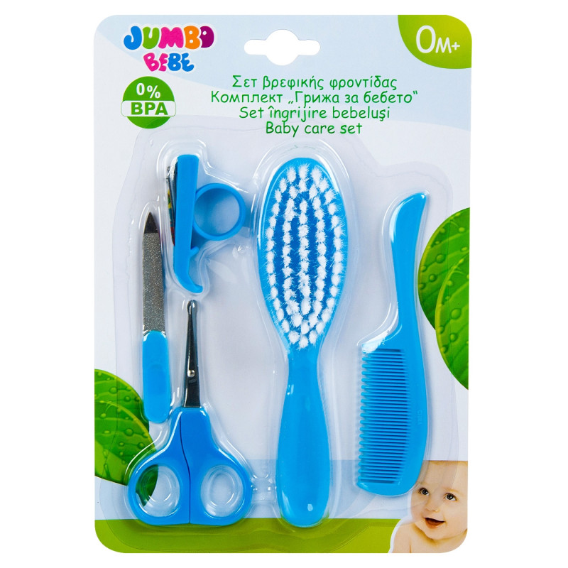Комплект Грижа за бебето състоящ се от 5 части в син цвят - гребен и четка за коса от изключително меки естествени влакна, ножичка, нокторезачка и пила.