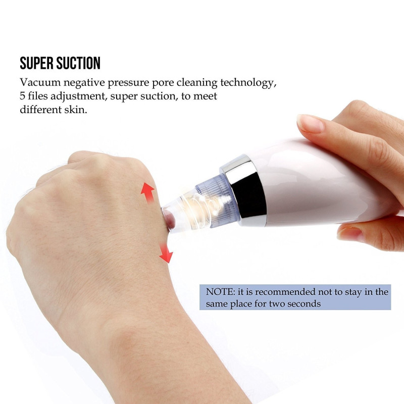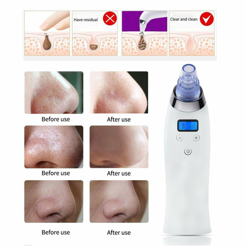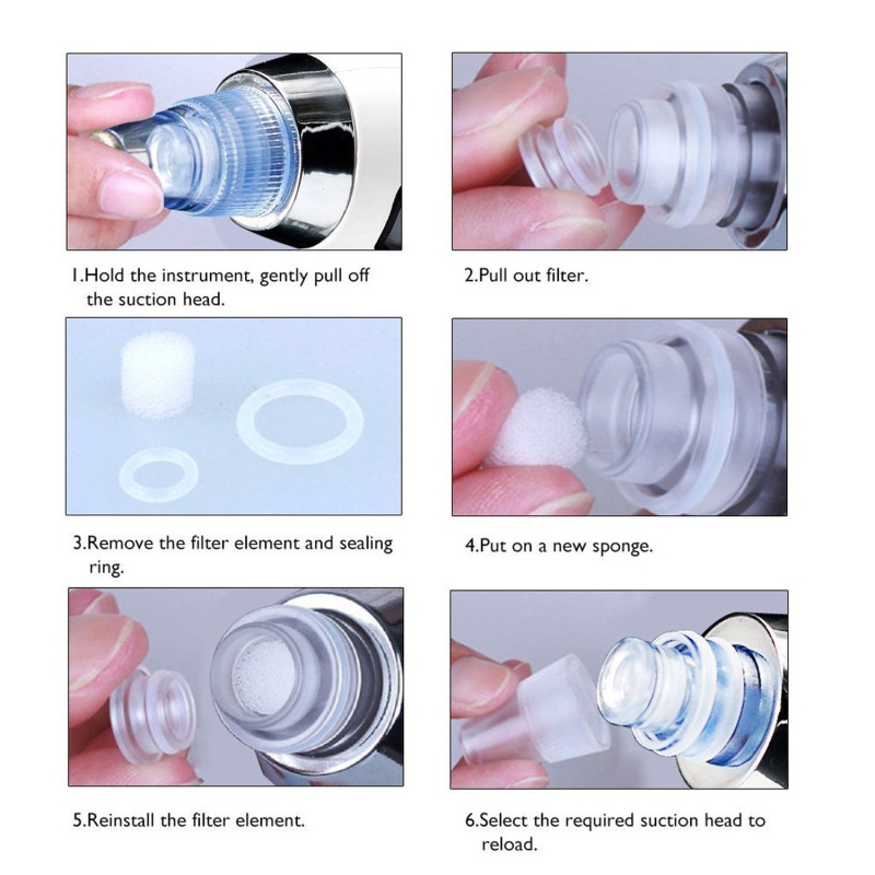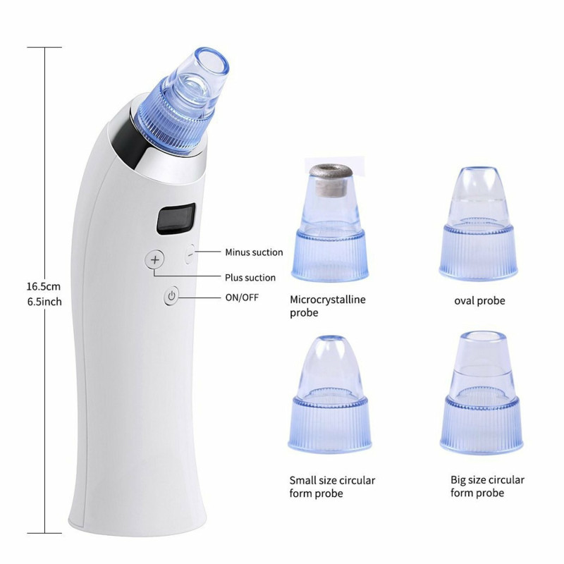 Комплектът включва 4 вакуумни приставки, всяка със своята специална функция. Големият накрайник е идеален за дълбоко отстраняване на черни точки, като прилага най-голямата сила на натиск. По-малкият накрайник е предназначен за чувствителни или по-труднодостъпни места, като намалява силата на засмукване. Приставката с микрокристали е перфектна за масаж и ексфолиация, премахвайки мъртвите клетки и възстановявайки нормалната секреция на себум. Елипсовидната глава е идеална за проблемна кожа с акне.