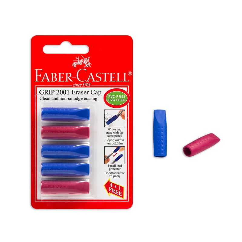 5 броя гуми за моливи тип шапка FABER-CASTELL в син и червен цвят. Поставят се на върха на молива - идеални за моливи без гума. Могат да се използват и като капачки за предпазване на графита от счупване, когато моливът е в раницата или несесера.