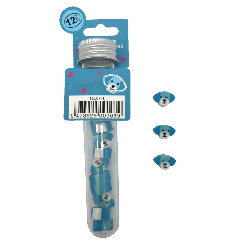 12 броя гуми за моливи във формата на кученца, които ще се харесат на всяко дете, което обича животните. Комплектът разполага с удобна кутийка с капак, в която да съхранявате тумите.