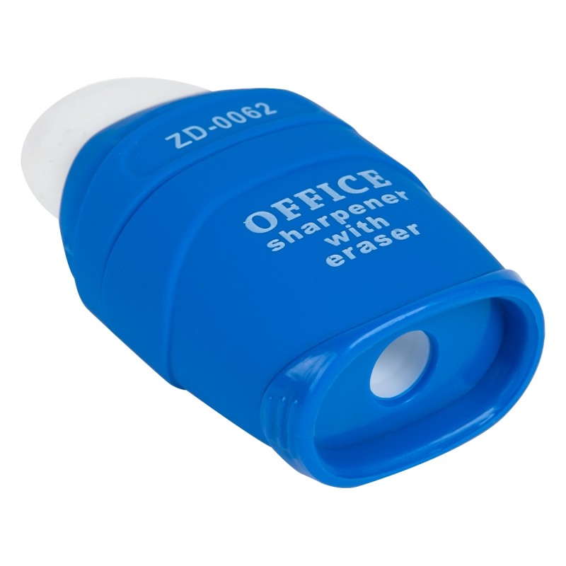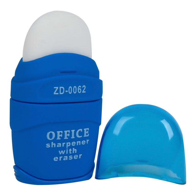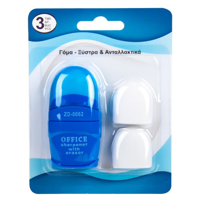 Гума за молив с капак + острилка в син цвят и подарък - 2 резервни гуми.