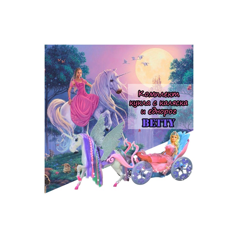 Комплект кукла с каляска и еднорог Betty