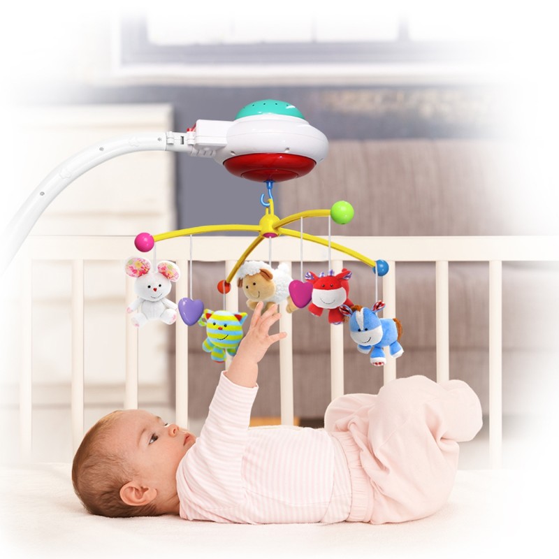 Нежната музика с различните комбинации от приспивни песнички помага на бебето освен да почива активно и да развива своите сетива, докато е будно, защото цветовете стимулират зрението му, а звуците неговия слух.