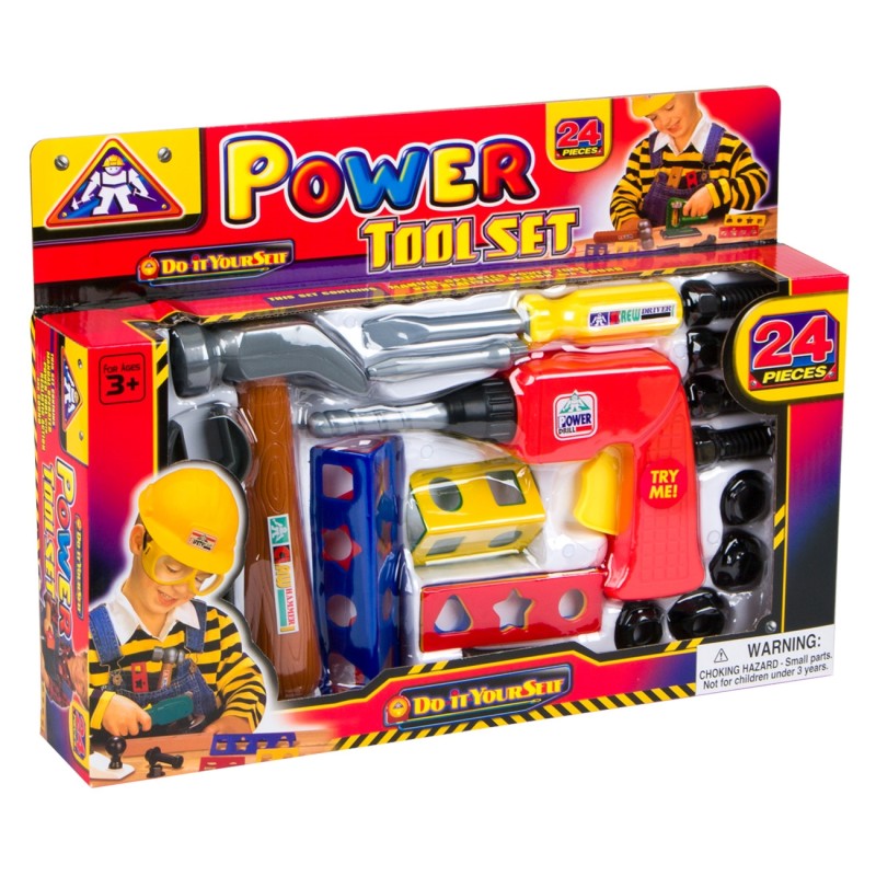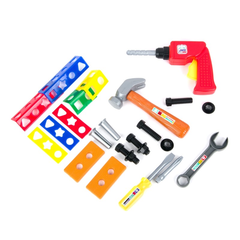 Детски комплект включващ 24 различни аксесоара и инструменти като гайки, винтове, чук, отвертка, гаечен ключ, бормашина и други.