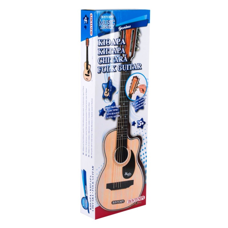 Детска китара в испански стил с 6 струни, изработена от висококачествена и напълно безопасна пластмаса в бежов цвят с метални механизми и перце.