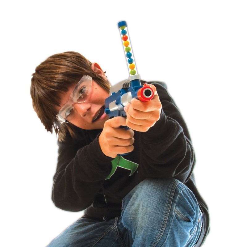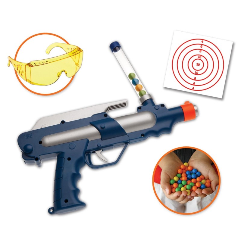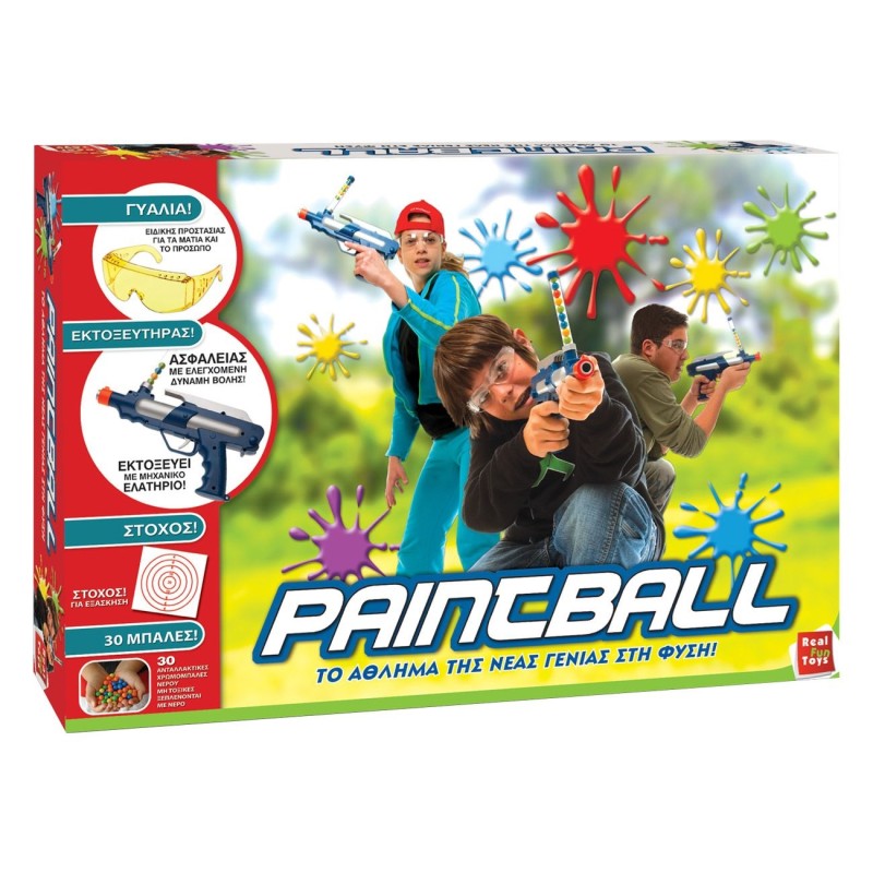 Детски комплект за пейнтбол включващ пистолет, защитни очила, мишена и 30 броя цветни топчета с боя на водна основа.