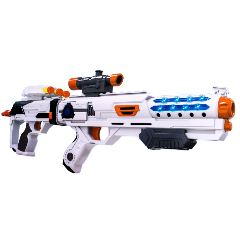 Космическа базука, изработена от качествена пластмаса в бял цвят със звук и светлина + 10 патрона за изстрелване.