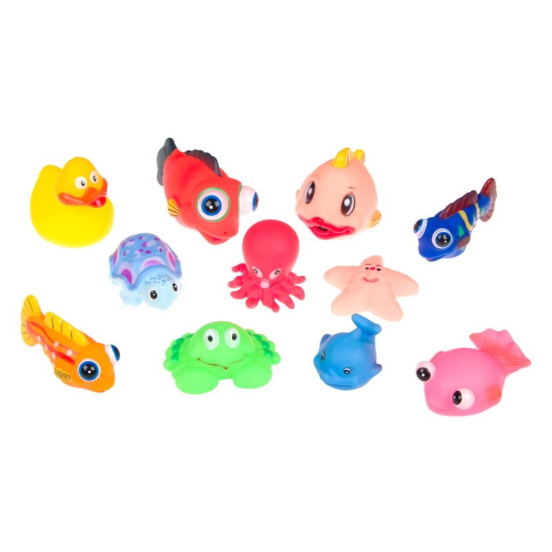 Опаковката съдържа 11 броя бебешки гумени играчки за баня във формата на различни животни - рибки, костенурка, октопод, рак, пате и други.