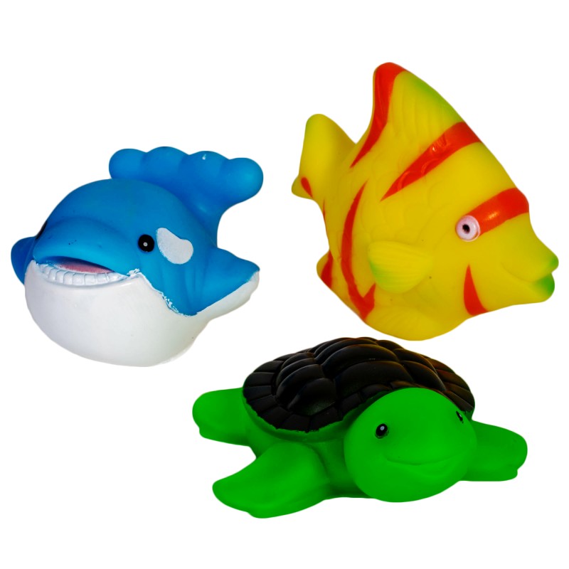 Комплект от 3 броя бебешки гумени играчки за баня в формата на морски обитатели - рибка, костенурка и косатка.