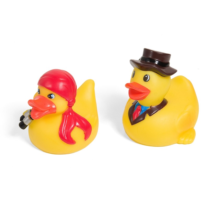 Комплект от 2 броя бебешки гумени играчки за баня - патета с различни шапки.