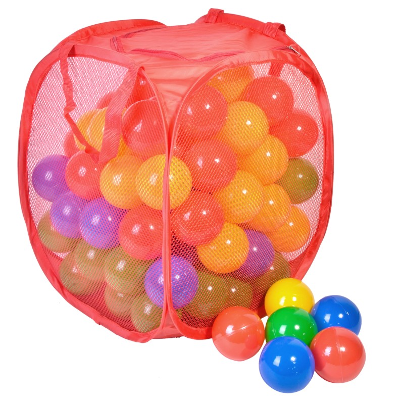 Голям комплект от 100 броя топчета за игра, изработени от здрава и безвредна пластмаса в различни ярки цветове заедно с голяма мрежеста чантичка с цип и дръжки за лесно съхранение и пренасяне.