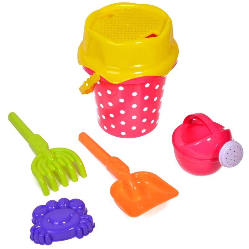 Комплект за пясък - пластмасова форма животно, мини лейка, кофичка с капак - сито, лопатка, гребло.
