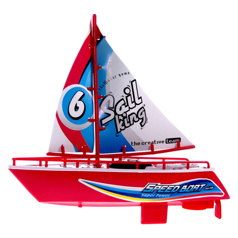 Плаваща играчка ветроходна лодка в червен цвят с големи платна и специална система за предвижване във вода.