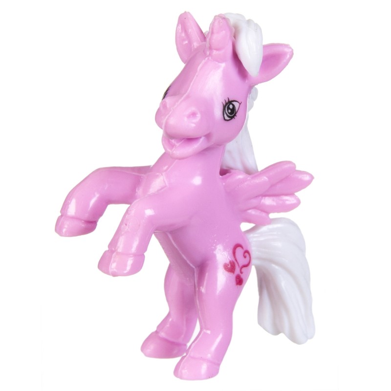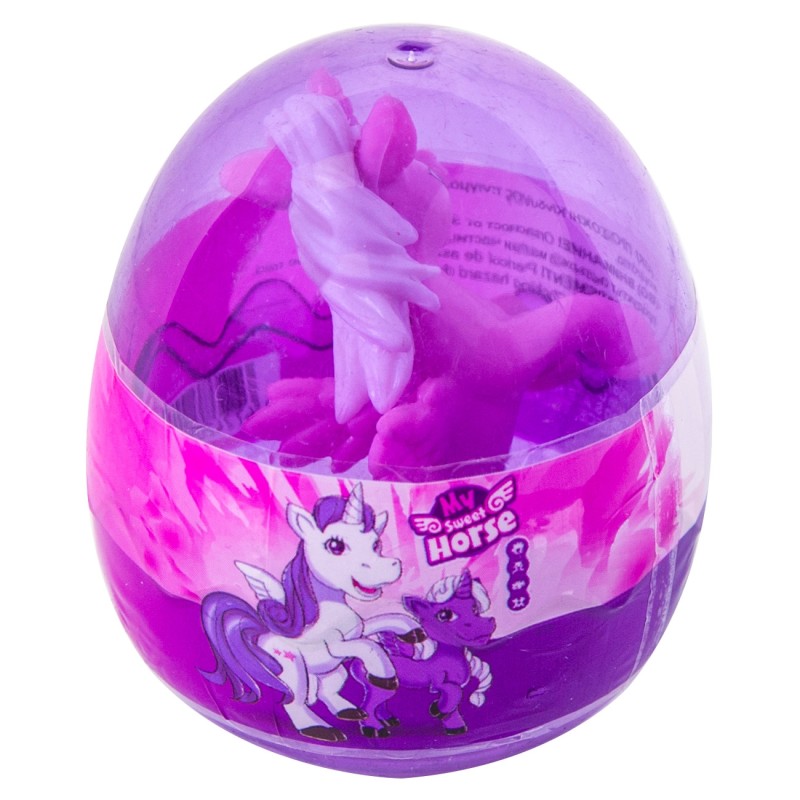 Мини фигурка еднорог в розов цвят с бяла опашка и грива в яйце от прозрачна пластмаса в лилав цвят.