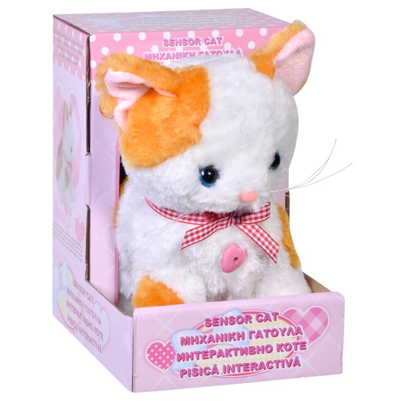 Интерактивна плюшена играчка котка в бяло и бежово със светлинен сензор и движение.