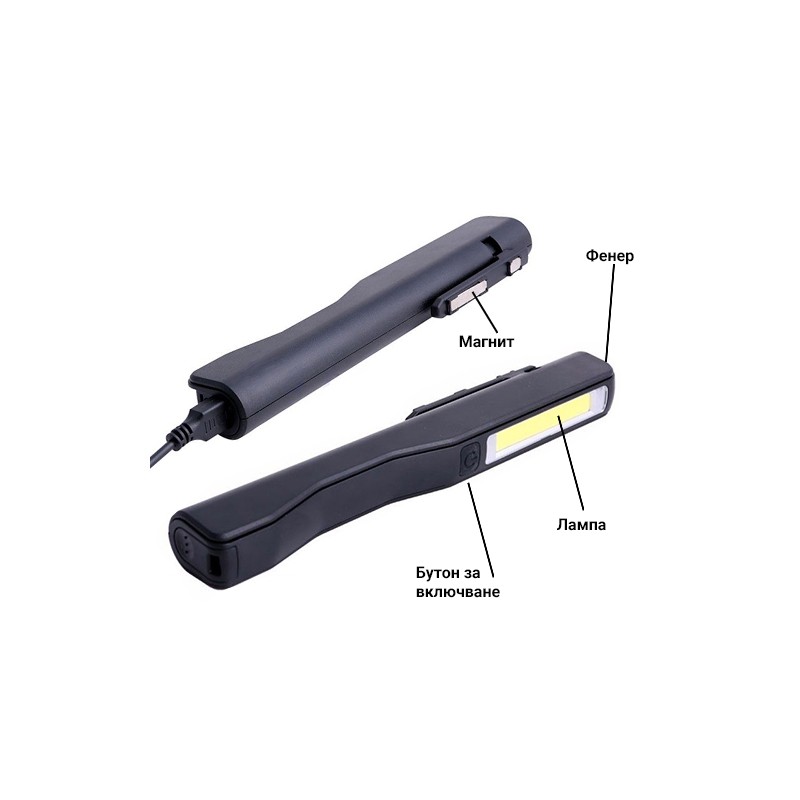 Работната лампа е разположена странично, а фенерчето е позиционирано на върха на уреда, като се пускат в работно положение, чрез бутон, при който с едно натискане първо светва фенерчето, а при второто натискане светва работната лампа.